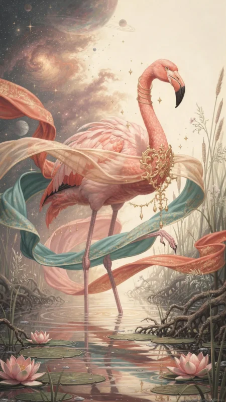 The Flamingo, in modern symbolism, may represent the delicate balance between the tangible and the intangible. Its vibrant pink hue suggests a connection to the emotional realm, while its grounded stance symbolizes practicality. This duality could manifest in your personal mythology as a reminder to honor both your feelings and your responsibilities, finding a harmonious middle ground between heart and mind.
